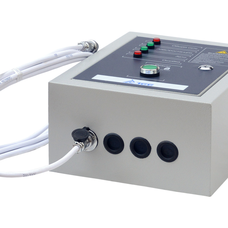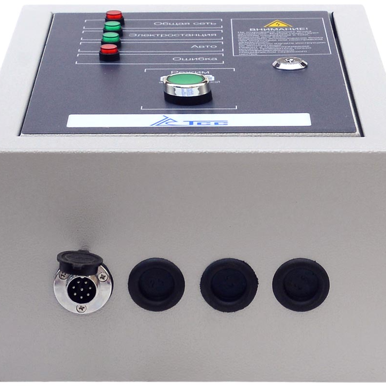 Блок АВР-С ТСС 10000/400 оборудован рядом контрольных ламп, которые наглядно отображают текущий статус и состояние электросети. Отдельный переключатель позволяет выбрать ручной или автоматический режим запуска генератора.