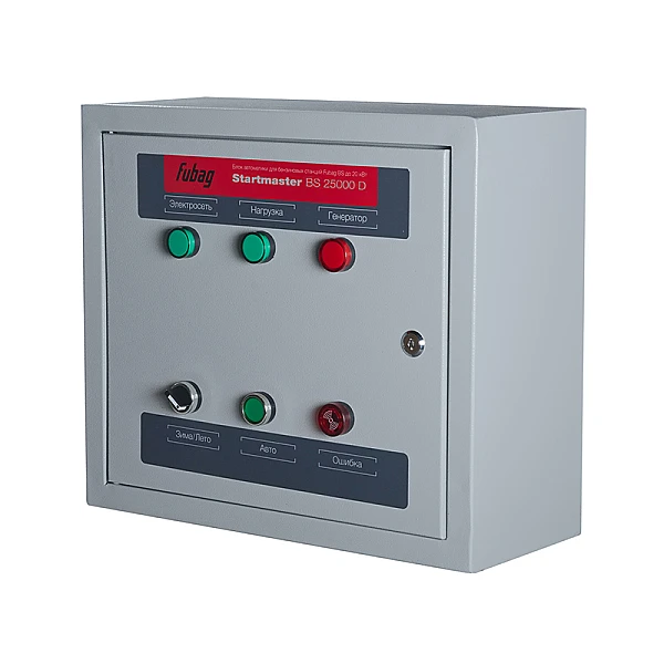 Блок автоматики FUBAG Startmaster BS 25000 D (400V) является опциональной принадлежностью к трехфазным бензиновым генераторам с функцией автозапуска. Система позволяет реализовать функции автоматического ввода резерва, обеспечивая запуск автономной электростанции и подключение к ней потребителей при перебоях в работе централизованных энергосистем без вмешательства пользователя. 8-метровый кабель управления включен в комплект поставки, что дает возможность размещать блок управления на удалении от генератора, в том числе в жилых помещениях.