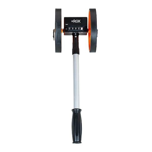 Инструмент позволяет фиксировать расстояния (как прямые отрезки, так и извилистые линии) до 9999.9 м с шагом 0.1 м и точностью ±0.5%. Конструкция дорожного курвиметра RGK Q5 основана на 2 колесах диаметром 159 мм. Такая схема вкупе с прочной резиновой шиной обеспечивает отличное сцепление с поверхностью, что положительно сказывается на качестве замеров.