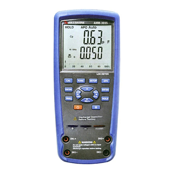 Профессиональный водонепроницаемый RLC-метр АММ-3035 — современный прибор с инновационной технологией автоматического измерения индуктивности, ёмкости, сопротивления, добротности, тангенса угла потерь или фазового угла и режимом определения полярности. Тестовая частота прибора составляет до 100 кГц.