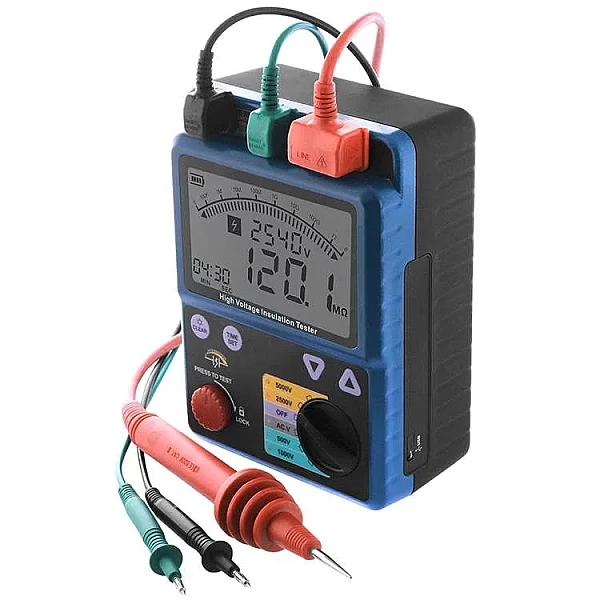 Портативный цифровой измеритель МЕГЕОН 13900 используется для определения сопротивления изоляции, а также для измерения постоянного/переменного напряжения и индекса поляризации (PI). Применяется профессиональными работниками для диагностики, техобслуживания и ремонта разных электрических двигателей, электроустановок, оборудования и выключателей. Устройство снабжено функцией автоматического переключения измерительных диапазонов (от 2 до 5). Присутствует звуковая и визуальная сигнализации подачи испытательного напряжения и авторазряда цепи после замера. Прибор имеет возможность автосохранения измеренных результатов на внутреннюю память.