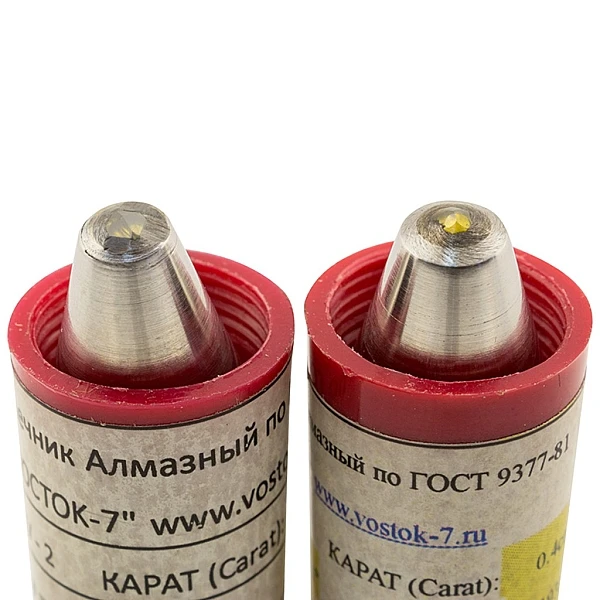 Наконечники алмазные для измерения твёрдости металлов и сплавов твердомерами "стационарного" типа. Наконечники изготовлены в соответствии с ГОСТ 9377-81 и прошли первичную поверку при выпуске из производства по ГОСТ 8.044-80.