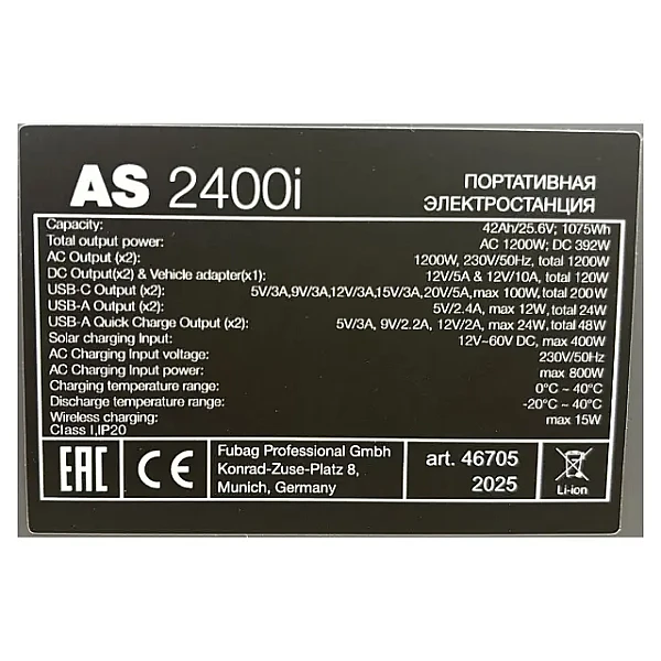 | Портативная электростанция Fubag AS 2400i | 1 шт. |